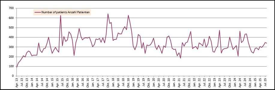 Durch besondere Umstände gibt es temporäre Anstiege in einer ansonsten im Mittel gleichbleibenden Kurve mit ca. 350 Patienten pro Monat. Diese besonderen Umstände können z.B. die jährliche Monsunzeit sein, in der es auf Grund der verschlammten Wege oft zu Unfällen kommt. Natürlich lassen solche Ereignisse wie das Erdbeben 2015 die Kurve ebenfalls sprunghaft ansteigen.